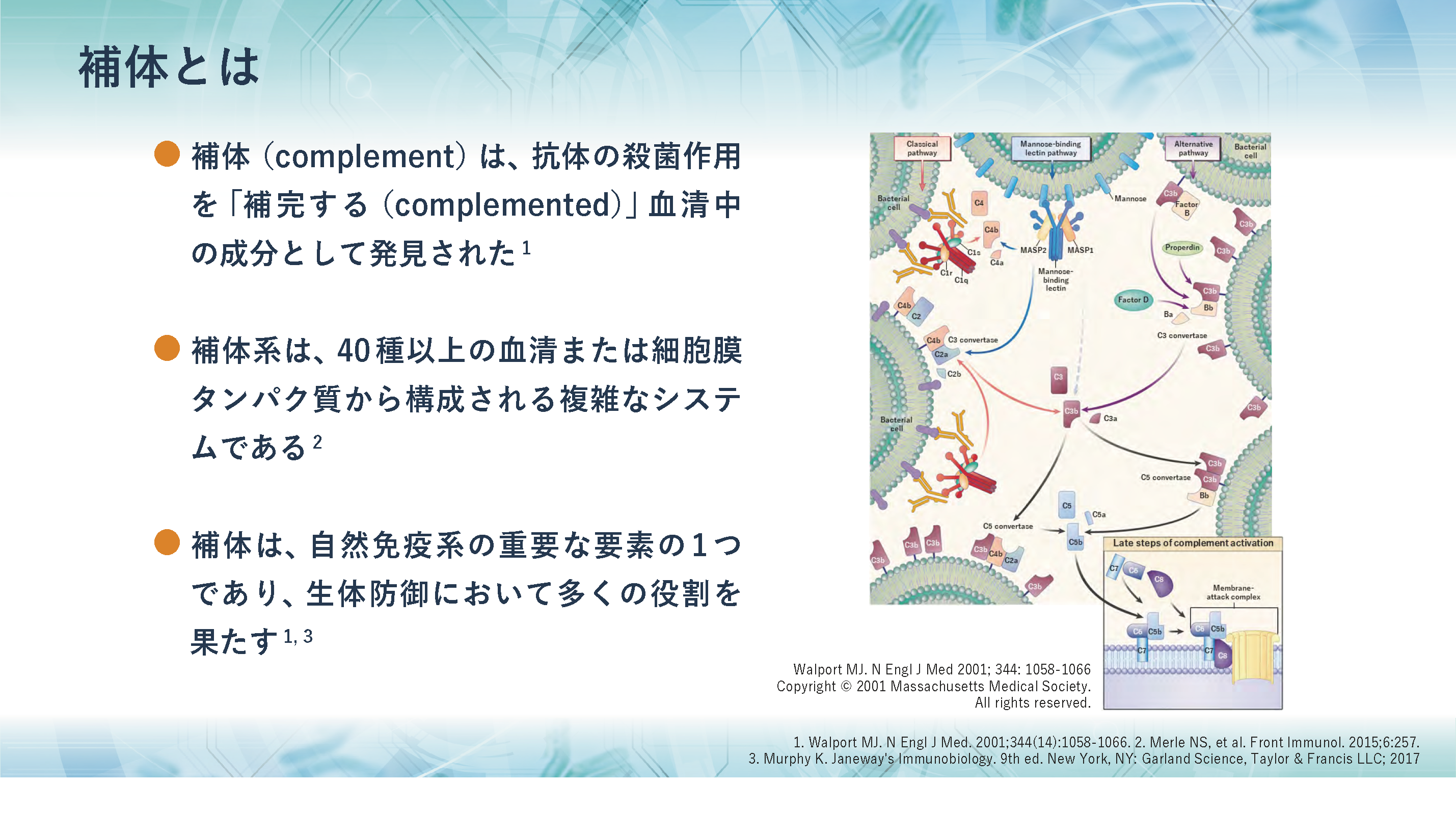 補体とは、いったいどのようなものでしょうか。補体系には多くの分子が関与しており、その作用機序や活性化機序はとても複雑です。近年、補体が関連するさまざまな疾患の病態が解明されるにつれ、補体と補体系に関する理解は急速に進展しています。