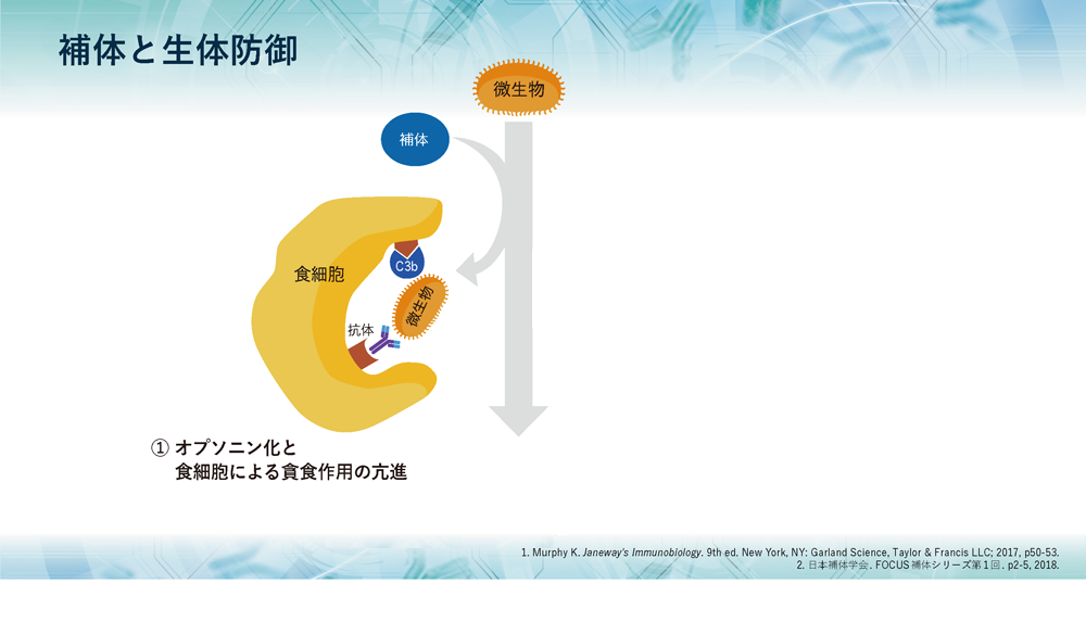 補体には大きく3つの役割があり、1つ目として、侵入してきた微生物や異物に抗体とともに結合して標識すること、すなわちオプソニン化することにより、食細胞の貪食作用を亢進します。また、異物排除とともに免疫複合体の除去も行います。