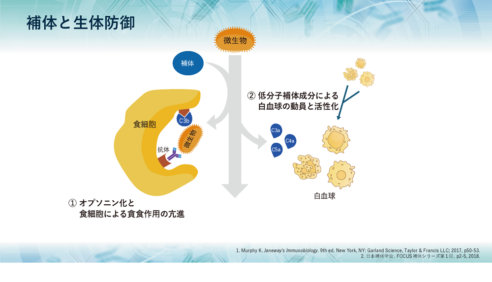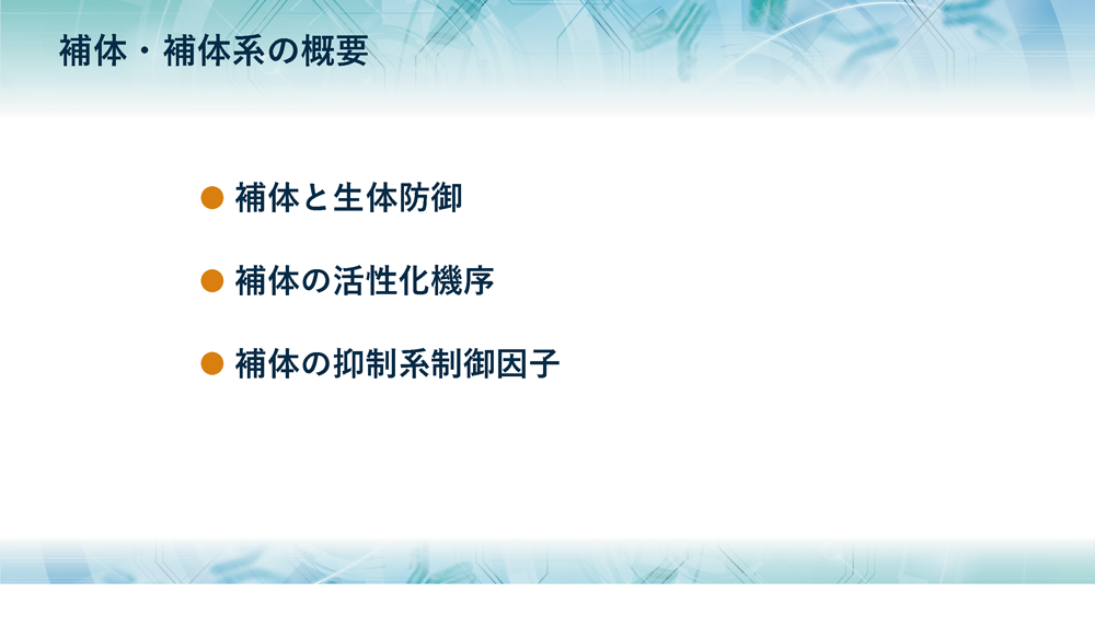 そこで今回は、正常状態での補体の本来の役割、すなわち、生体防御において補体が果たす役割や、補体の活性化機序、さらには補体系を抑制する制御因子の機能と役割についてご紹介します。