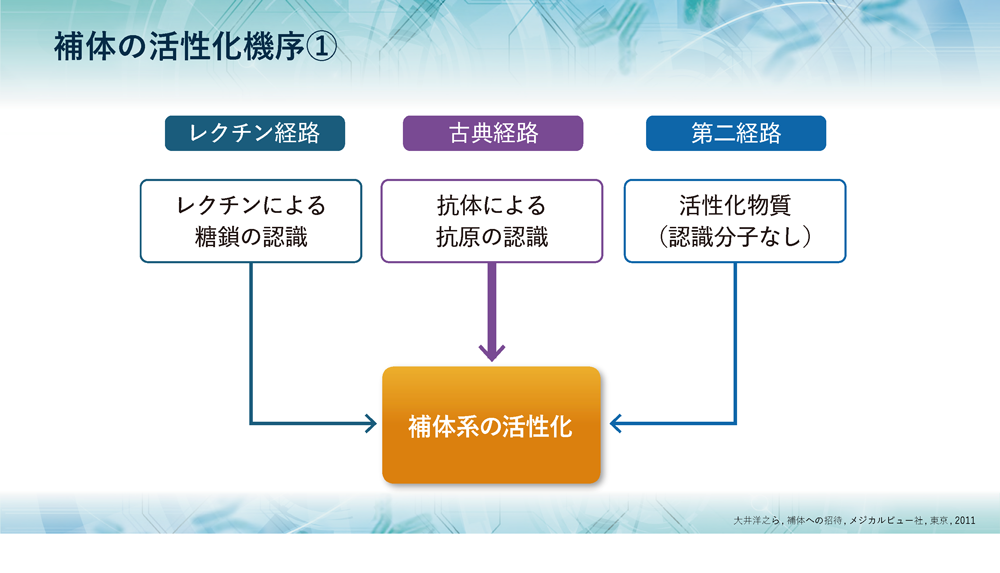 補体は、古典経路、レクチン経路、第二経路の3つの経路により活性化されることがわかっています。 古典経路は、抗体が抗原を認識し、抗原抗体反応することによって始動します。レクチン経路は、糖鎖結合性タンパク質のレクチンが、病原体の表面の糖鎖を認識することによって始動します。そして、第二経路は、C3が活性化することによって始動します。