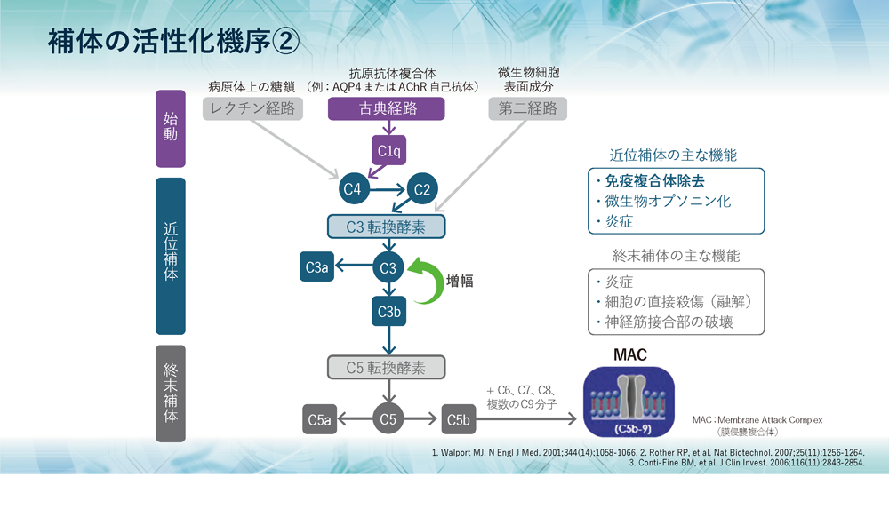 今回は、正常状態での補体の本来の役割、補体の活性化機序、補体系を抑制する制御因子の機能と役割についてご紹介しました。 補体は、活性化の過程で生成される各補体成分が、生体防御において重要な役割を果たしていること、その一方で、自己細胞膜上には補体系を抑制する制御因子が存在し、補体による自己細胞の破壊を阻止していることがおわかりいただけたと思います。 次回は、重症筋無力症の病態において、補体がどのように関わっているかについてご紹介します。